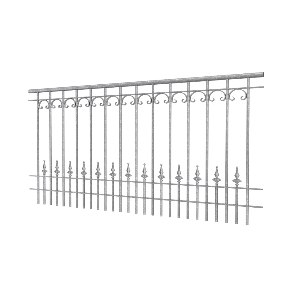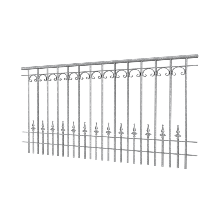 Verfijnd design in een nostalgische stijl: onze "Lucca" reling heeft talrijke details zoals tussenregels, decoratieve spikes in de vorm van bollelies en C-decoraties - voor een elegant en stijlvol karakter. De "Lucca" balkonreling is met de hand gesmeed uit massief, weerbestendig metaal. De reling is 192,5 cm breed en 90 cm hoog (voor montage).