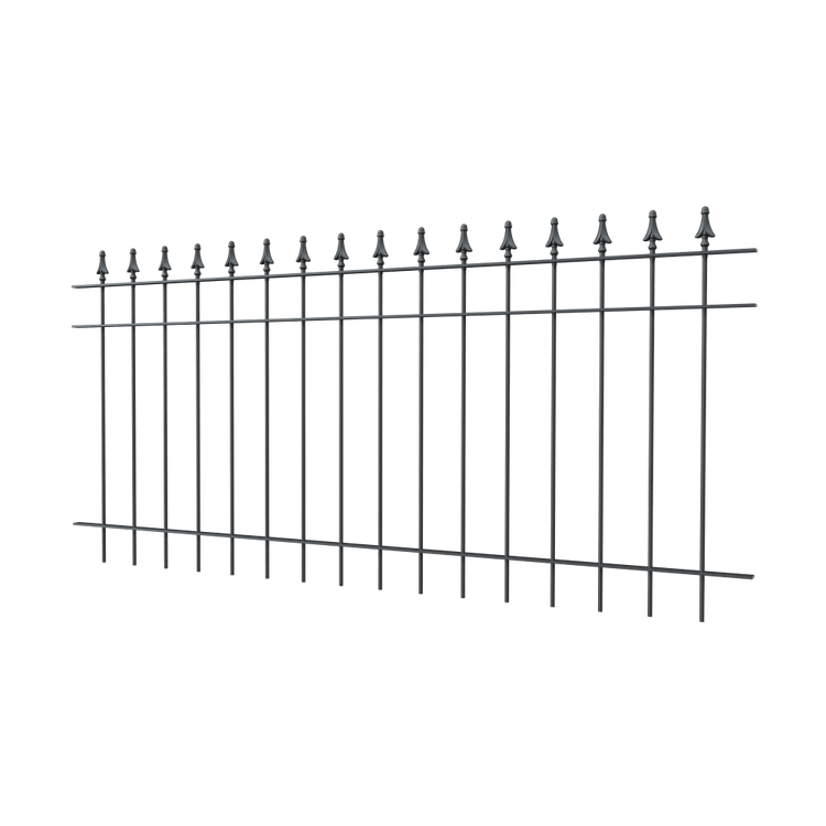 Bekroond met elegante dennentoppen: het hekmodel “Pino” combineert eenvoudige elegantie met mooi gevormde details. De blikvangers zijn de dennenvormige toppen. Ondanks het delicate uiterlijk maakt het metalen hekwerk “Pino” indruk met zijn stevige stabiliteit. Het tuinhek is met de hand gemaakt van weerbestendig smeedijzer. De standaardbreedte per element is 192,5 cm en de standaardhoogte is 90 cm.