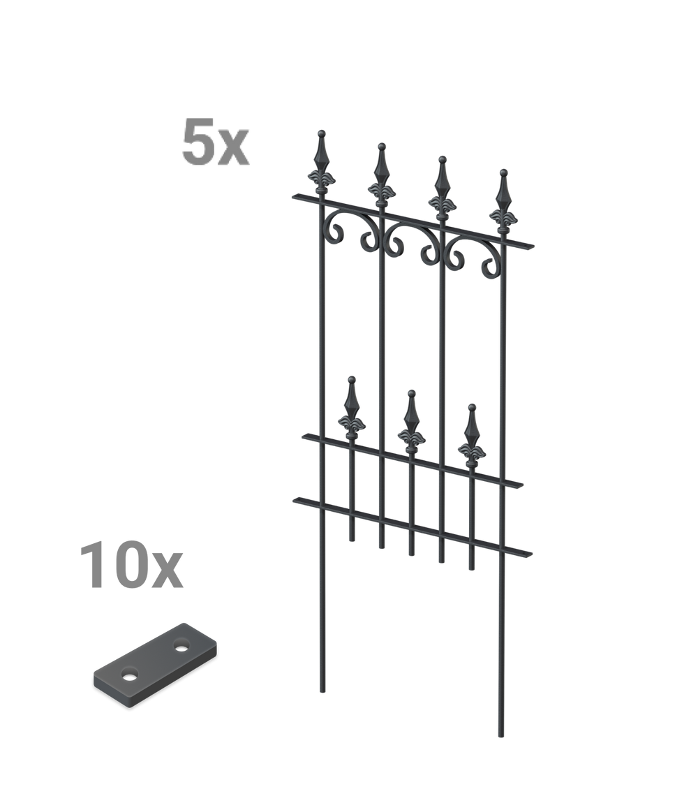 Onze "Lucca" sierhekje in een voordelige set Met zijn artistieke C-designs en elegante "ball lily" siertop geeft ons populaire "Lucca" omheiningsmodel uw tuin een speciaal tintje. In de praktische insteekomheiningsset tegen een speciale prijs ontvangt u vijf omheiningselementen van elk 50 cm breed en 105 cm hoog (inclusief decoratieve bovenkant en grondverankering). De montage is bijzonder eenvoudig: de elementen van hoogwaardig metaal worden gewoon in de grond gestoken en stevig aan elkaar geschroefd met behulp van de meegeleverde verbindingsstukken. Je kunt zelf de coating kiezen uit de volgende opties: poedercoating volgens het duplexprocedé, thermisch verzinkt of ongecoat (roestvrij staal).